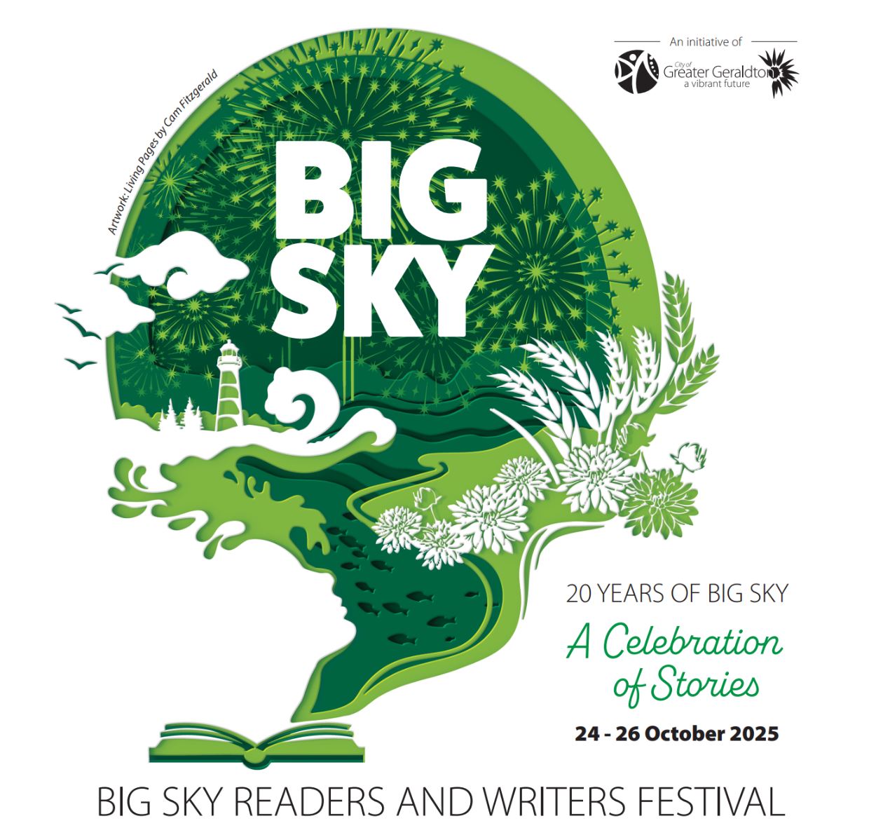 We thank our wonderful library patrons and community partners who are the bedrock of our regional festival. In 2018, I welcomed the handing of the baton and feel privileged here in 2025, alongside the amazing team at the Geraldton Regional Library and our special guests, to deliver this milestone Festival programme, “20 Years of Big Sky: A Celebration of Stories”.